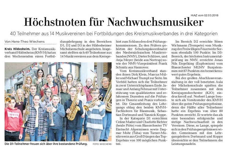 Nicht weniger erfolgreich war auch der befreundete Musikzug der Feuerwehr Harsum, der beim Wertungsspiel unter der Leitung von Robin Boie mit den beiden Stücken “Seagate Overture“ sowie “Alpine Inspirations“ ebenfalls einen großartigen Erfolg erzielte und auch mit “sehr gut“ bewertet wurde.
